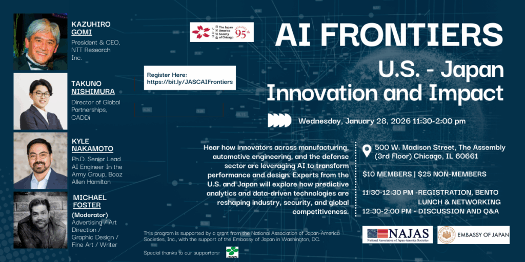 The Japan America Society of Chicago creates and promotes Japanese and American friendships. We do this through business, social, educational and cultural activities. We are the only organization in Chicago that touches all of these areas in American and Japanese relationships.
