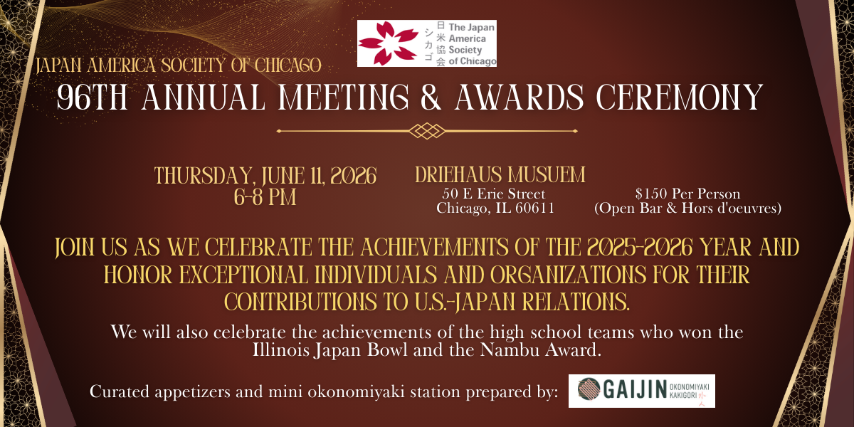 The Japan America Society of Chicago creates and promotes Japanese and American friendships. We do this through business, social, educational and cultural activities. We are the only organization in Chicago that touches all of these areas in American and Japanese relationships.